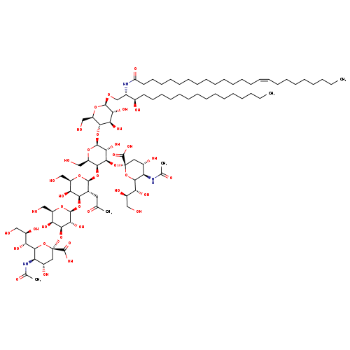 | SMILES | CCCCCCCCCCCCCCC[C@@H](O)[C@H](CO[C@@H]1O[C@H](CO)[C@@H](O[C@@H]2O[C@H](CO)[C@H](O[C@@H]3O[C@H](CO)[C@H](O)[C@H](O[C@@H]4O[C@H](CO)[C@H](O)[C@H](O[C@@]5(C[C@H](O)[C@@H](NC(C)=O)C(O5)[C@H](O)[C@H](O)CO)C(O)=O)[C@H]4O)[C@H]3CC(C)=O)[C@H](O[C@@]3(C[C@H](O)[C@@H](NC(C)=O)C(O3)[C@H](O)[C@H](O)CO)C(O)=O)[C@H]2O)[C@H](O)[C@H]1O)NC(=O)CCCCCCCCCCCCC\C=C/CCCCCCCC |