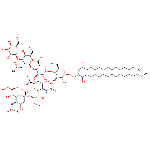 | SMILES | CCCCCCCCCCCCCCC[C@@H](O)[C@H](CO[C@@H]1O[C@H](CO)[C@@H](O[C@@H]2O[C@H](CO)[C@H](O[C@@H]3O[C@H](CO)[C@H](O)[C@H](O[C@@H]4O[C@H](CO)[C@H](O)[C@H](O)[C@H]4O)[C@H]3CC(C)=O)[C@H](O[C@@]3(C[C@H](O)[C@@H](NC(C)=O)C(O3)[C@H](O)[C@@H](CO)O[C@@]3(C[C@H](O)[C@@H](NC(C)=O)C(O3)[C@H](O)[C@H](O)CO)C(O)=O)C(O)=O)[C@H]2O)[C@H](O)[C@H]1O)NC(=O)CCCCCCCCCCCCC |