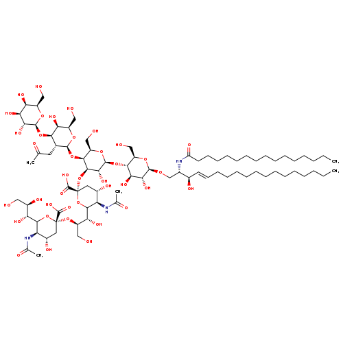 | SMILES | CCCCCCCCCCCCCCCC(=O)N[C@@H](CO[C@@H]1O[C@H](CO)[C@@H](O[C@@H]2O[C@H](CO)[C@H](O[C@@H]3O[C@H](CO)[C@H](O)[C@H](O[C@@H]4O[C@H](CO)[C@H](O)[C@H](O)[C@H]4O)[C@H]3CC(C)=O)[C@H](O[C@@]3(C[C@H](O)[C@@H](NC(C)=O)C(O3)[C@H](O)[C@@H](CO)O[C@@]3(C[C@H](O)[C@@H](NC(C)=O)C(O3)[C@H](O)[C@H](O)CO)C(O)=O)C(O)=O)[C@H]2O)[C@H](O)[C@H]1O)[C@H](O)\C=C\CCCCCCCCCCCCC |
