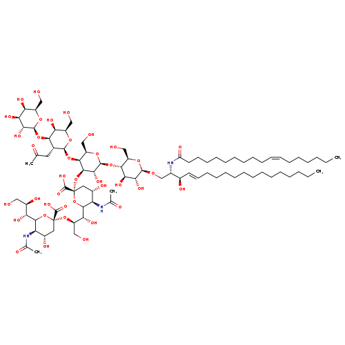| SMILES | CCCCCCCCCCCCC\C=C\[C@@H](O)[C@H](CO[C@@H]1O[C@H](CO)[C@@H](O[C@@H]2O[C@H](CO)[C@H](O[C@@H]3O[C@H](CO)[C@H](O)[C@H](O[C@@H]4O[C@H](CO)[C@H](O)[C@H](O)[C@H]4O)[C@H]3CC(C)=O)[C@H](O[C@@]3(C[C@H](O)[C@@H](NC(C)=O)C(O3)[C@H](O)[C@@H](CO)O[C@@]3(C[C@H](O)[C@@H](NC(C)=O)C(O3)[C@H](O)[C@H](O)CO)C(O)=O)C(O)=O)[C@H]2O)[C@H](O)[C@H]1O)NC(=O)CCCCCCCCC\C=C/CCCCCC |