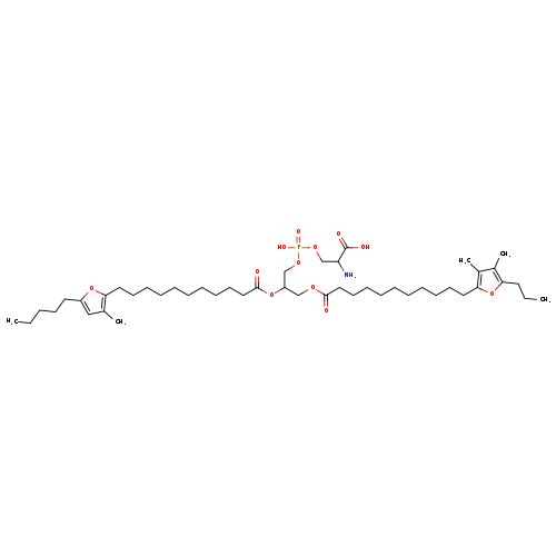 | Traditional Name | 2-amino-3-[(3-{[11-(3,4-dimethyl-5-propylfuran-2-yl)undecanoyl]oxy}-2-{[11-(3-methyl-5-pentylfuran-2-yl)undecanoyl]oxy}propoxy(hydroxy)phosphoryl)oxy]propanoic acid |