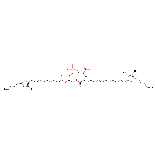 | Traditional Name | 2-amino-3-[(3-{[13-(3,4-dimethyl-5-pentylfuran-2-yl)tridecanoyl]oxy}-2-{[9-(3-methyl-5-pentylfuran-2-yl)nonanoyl]oxy}propoxy(hydroxy)phosphoryl)oxy]propanoic acid |