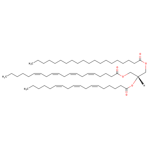 | 1-Arachidonyl-2-g-linolenoyl-3-arachidonoyl-glycerol | HMDB | | 1-Eicosanoyl-2-(6Z,9Z,12Z-octadecatrienoyl)-3-(5Z,8Z,11Z,14Z-eicosatetraenoyl)-glycerol | HMDB | | TAG(20:0/18:3/20:4) | HMDB | | TAG(58:7) | HMDB | | TG(20:0/18:3/20:4) | HMDB | | TG(58:7) | HMDB | | Tracylglycerol(20:0/18:3/20:4) | HMDB | | Tracylglycerol(58:7) | HMDB | | Triacylglycerol | HMDB | | Triglyceride | HMDB | | TG(20:0/18:3(6Z,9Z,12Z)/20:4(5Z,8Z,11Z,14Z)) | Lipid Annotator |