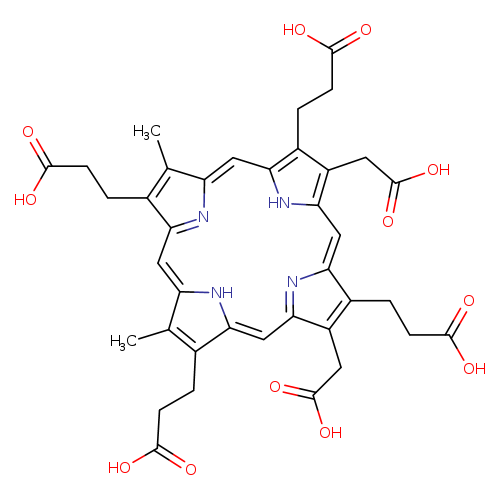 | InChI Identifier | InChI=1S/C38H38N4O12/c1-17-19(3-7-33(43)44)27-13-25-18(2)20(4-8-34(45)46)28(40-25)15-31-24(12-38(53)54)22(6-10-36(49)50)30(42-31)16-32-23(11-37(51)52)21(5-9-35(47)48)29(41-32)14-26(17)39-27/h13-16,40-41H,3-12H2,1-2H3,(H,43,44)(H,45,46)(H,47,48)(H,49,50)(H,51,52)(H,53,54)/b25-13-,26-14-,27-13-,28-15-,29-14-,30-16-,31-15-,32-16- |