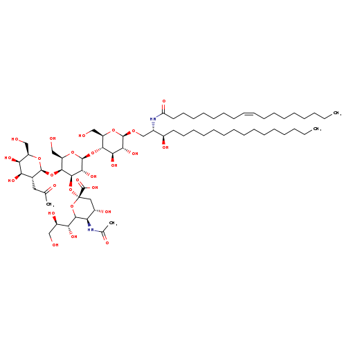 | SMILES | CCCCCCCCCCCCCCC[C@@H](O)[C@H](CO[C@@H]1O[C@H](CO)[C@@H](O[C@@H]2O[C@H](CO)[C@H](O[C@@H]3O[C@H](CO)[C@H](O)[C@H](O)[C@H]3CC(C)=O)[C@H](O[C@@]3(C[C@H](O)[C@@H](NC(C)=O)C(O3)[C@H](O)[C@H](O)CO)C(O)=O)[C@H]2O)[C@H](O)[C@H]1O)NC(=O)CCCCCCC\C=C/CCCCCCCC |