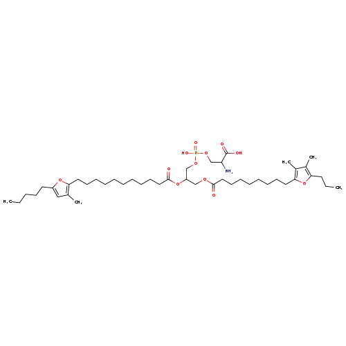 | Traditional Name | 2-amino-3-[(3-{[9-(3,4-dimethyl-5-propylfuran-2-yl)nonanoyl]oxy}-2-{[11-(3-methyl-5-pentylfuran-2-yl)undecanoyl]oxy}propoxy(hydroxy)phosphoryl)oxy]propanoic acid |